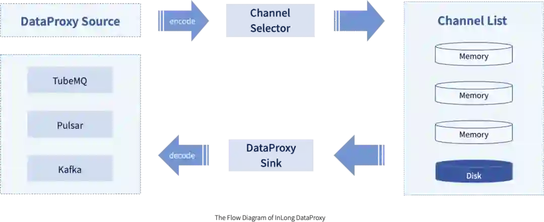 相比较其他数据集成解决方案,InLong 架构最明显的区别,在数据采集和消息队列中间,多了一个叫做 DataProxy 的服务。InLong DataProxy 主要有连接收敛、路由、数据压缩和协议转换等作用。DataProxy 充当了 InLong 采集端到消息队列的桥梁,当 DataProxy 从 Manager 模块拉取数据流元数据后,数据流和消息队列 Topic 名称对应关系也就确定了。当 DataProxy 收到消息时,会首先发送到 Memory Channel 中进行压缩,并使用本地的 Producer 往后端 Cache 层(即消息队列)发送数据。当消息队列异常出现发送失败时,DataProxy 会将消息缓存到 Disk Channel,也就是本地磁盘中。InLong DataProxy 整体架构基于 Apache Flume,扩展了 Source 层和 Sink 层,并对容灾转发做了优化处理,提升了系统的稳定性。下图为 DataProxy 数据处理流程:
