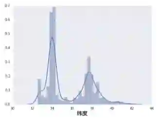 下面的曲线图显示了加利福尼亚州不同纬度的房屋相对普及率。注意集群 - 洛杉矶大致在纬度 34 处,旧金山大致在纬度 38 处。