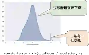 下面的曲线图表示的是加利福尼亚州住房数据集中称为 roomsPerPerson 的特征。roomsPerPerson 值的计算方法是相应地区的房间总数除以相应地区的人口总数。该曲线图显示,在加利福尼亚州的绝大部分地区,人均房间数为 1 到 2 间。不过,请看一下 x 轴。