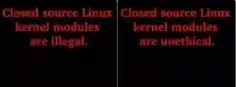Linux 在代码上没有完全禁止闭源的驱动,这个曾被 LKM 的讨论者揪住不放。是出自 /usr/src/linux/include/linux/module.h 的头文件定义,/* * The following license idents are currently accepted as indicating free * software modules * * "GPL" [GNU Public License v2 or later] * "GPL v2" [GNU Public License v2] * "GPL and additional rights" [GNU Public License v2 rights and more] * "Dual BSD/GPL" [GNU Public License v2 * or BSD license choice] * "Dual MPL/GPL" [GNU Public License v2 * or Mozilla license choice] * * The following other idents are available * * "Proprietary" [Non free products]在这个问题上,Linux 内核的作者认为存在 LKM 可以不遵循 GPL 的灰色区域,他举的灰色区域的例子是说,比如说,某些 Linux 模块原本针对 Unix 系统进行开发,由于接口接近,被移植到 Linux 上,那么他认为这个模块不是 GPL 的。(one gray area in particular is something like a driver that was originally written for another operating system (i.e. clearly not a derived work of Linux in origin). [...] THAT is a gray area, and _that_ is the area where I personally believe that some modules may be considered to not be derived works simply because they weren't designed for Linux and don't depend on any special Linux behaviour.)(摘录自维基百科,Linux kernel 的 Loadable kernel modules and firmware 章节。)