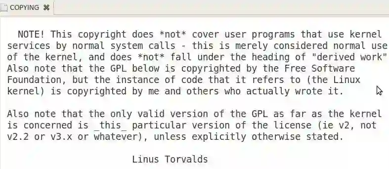 重新回到这三个问题,第一个问题,曾经被 Linux 内核的作者 Linus Torvalds 以及内核开发人员多次澄清普通系统调用为非 GPL 的作用范围,甚至固化在 Linux 内核的源码 COPYING 文档中,为 Linux 用户空间的程序采用非 GPL 的授权许可证打下了基础。