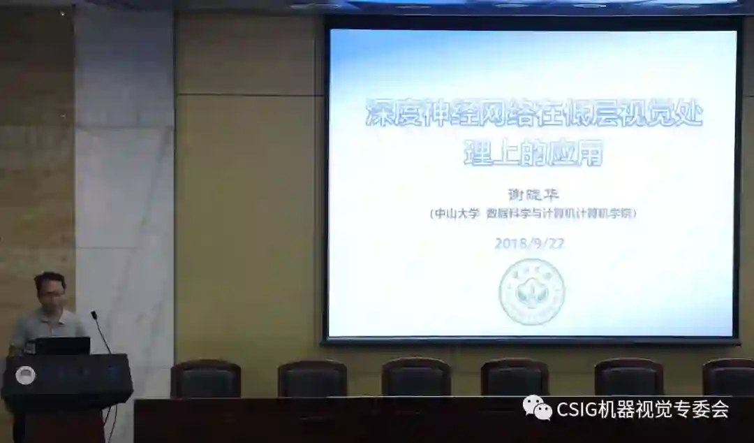 中山大学副教授、博士生导师谢晓华做了题为“深度神经网络在低层视觉处理上的应用”的学术报告,介绍了深度神经网络在若干低层视觉处理任务(包括图像本征属性重建、图像超分辨率、人脸图像光照处理、图像去模糊、人脸对齐等)上的许多新方法与新技术。