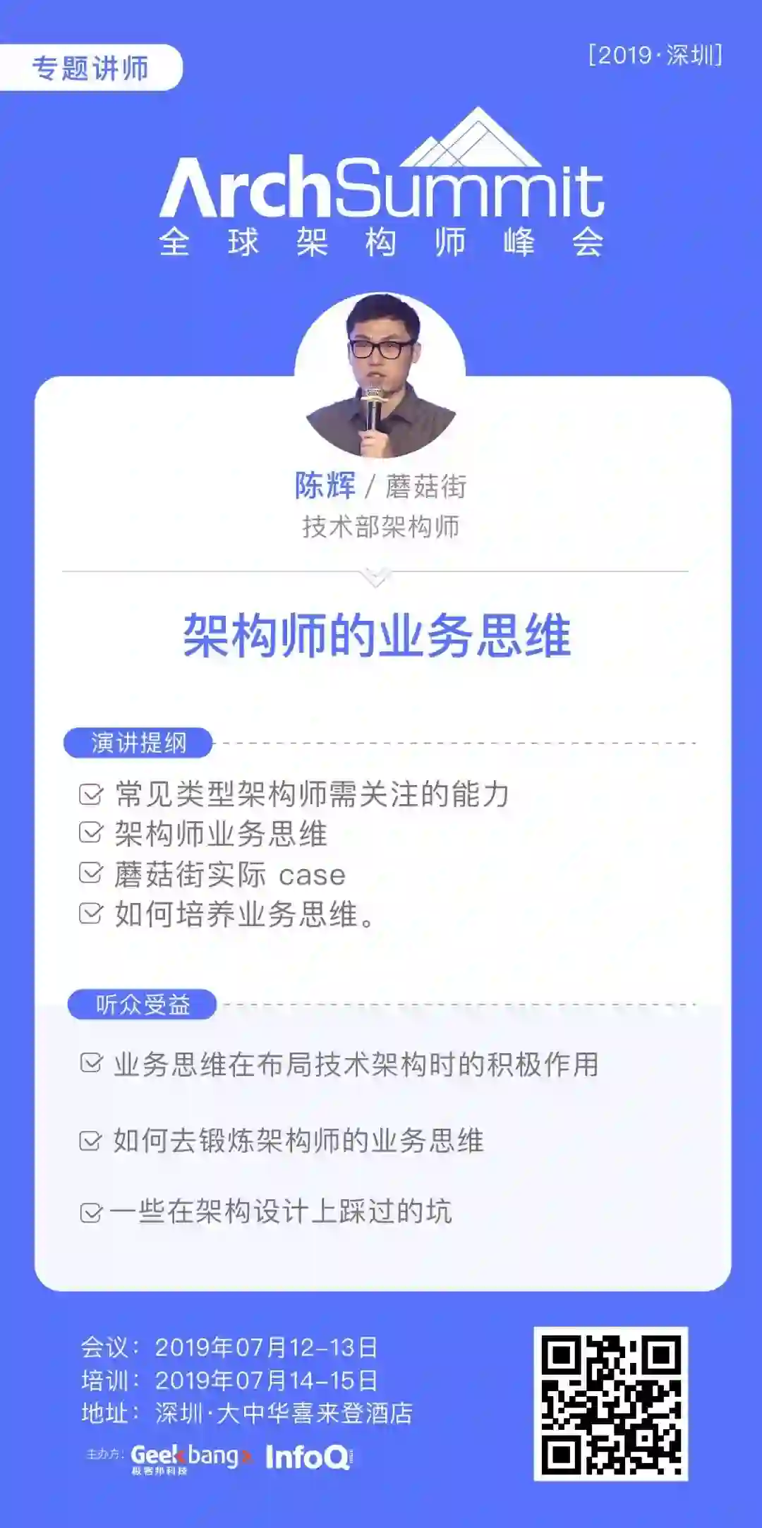 7 月深圳 ArchSummit 会议上,我会分享如何锻炼自己的业务思维,以及我自己过去的经验新心得,感兴趣的可以来现场交流。现在 8 折购票,可以联系票务灰灰 17326843116