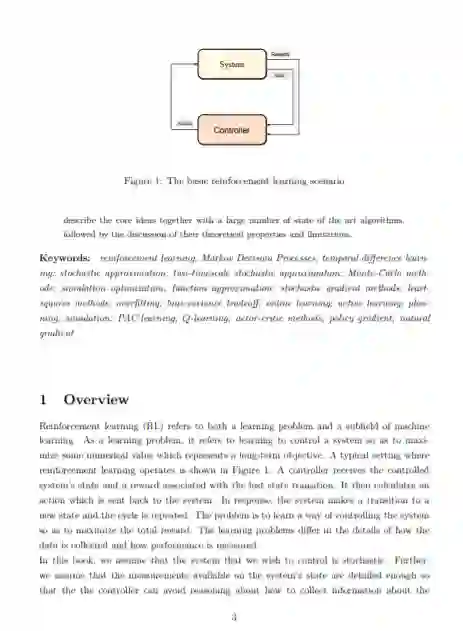 强化学习是一种学习范式,它关注于如何学习控制一个系统,从而最大化表达一个长期目标的数值性能度量。强化学习与监督学习的区别在于,对于学习者的预测,只向学习者提供部分反馈。此外,预测还可能通过影响被控系统的未来状态而产生长期影响。因此,时间起着特殊的作用。强化学习的目标是开发高效的学习算法,以及了解算法的优点和局限性。强化学习具有广泛的实际应用价值,从人工智能到运筹学或控制工程等领域。在这本书中,我们重点关注那些基于强大的动态规划理论的强化学习算法。我们给出了一个相当全面的学习问题目录,描述了核心思想,关注大量的最新算法,然后讨论了它们的理论性质和局限性。