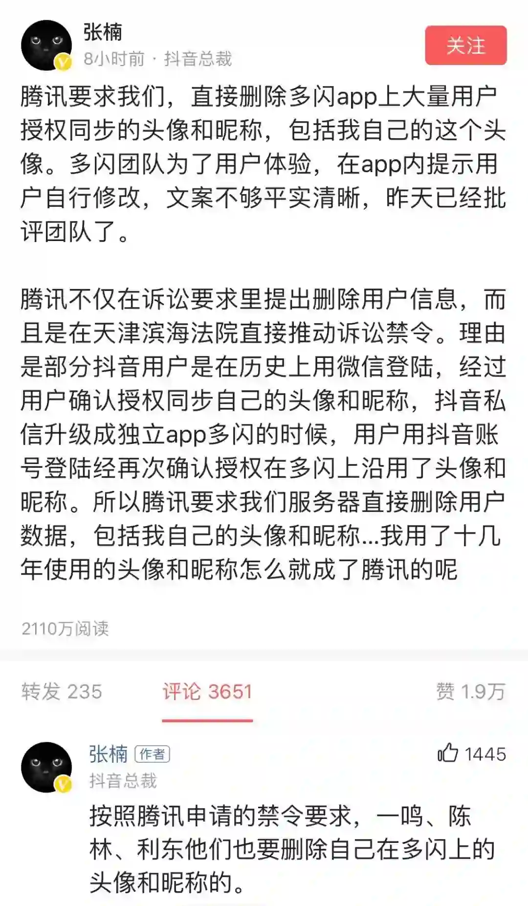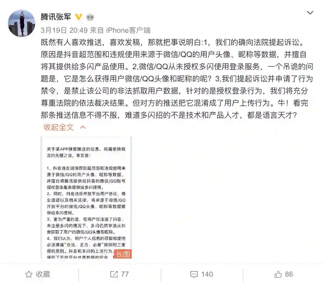 抖音总裁张楠在微头条表示,“腾讯要求我们,直接删除多闪App上大量用户授权同步的头像和昵称,包括我自己的这个头像。多闪团队为了用户体验,在App内提示用户自行修改,文案不够平实清晰,昨天已经批评团队了。”张楠称,“腾讯要求我们服务器直接删除用户数据,包括我自己的头像和昵称……我用了十几年使用的头像和昵称怎么就成了腾讯的呢?”随后张楠又在评论中说:“按照腾讯申请的禁令要求,张一鸣、陈林他们在多闪上的头像也要被删除。”