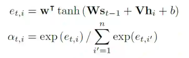 在步骤t时, 解码器预测一个字符或一个停止符号(EOS),根据编码器的输出H,内部状态st−1,和上一步的预测结果yt−1 。在这一步中,解码器首先计算注意力权重,αt∈Rn,通过其注意机制公式: