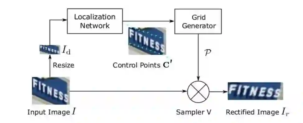 STN网络的核心是将图片空间矫正过程构建成可学习模型,流程如图所示。先将输入图片downsample到Id,定位网络与格点生成器生成TPS变换的参数,再通过采样器(sampler)生成矫正后的图片Ir 。