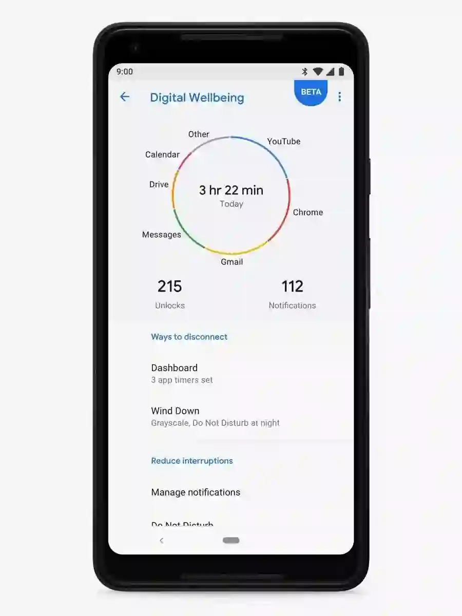 在Android Pie中,这意味着你可以进入设置,看到一个指示板,它会告诉你你今天在手机上花了多少时间,以及哪些应用和服务是最消耗时间的。你会知道你每天打开手机多少次,收到多少通知。