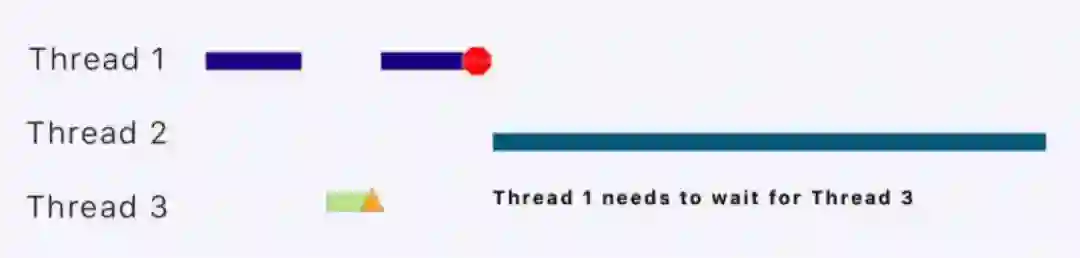 一旦我们加入锁机制,上面的线程饥饿就会变得很有趣。现在假设有一个低优先级的线程 3,它锁定了一个资源。高优先级线程 1 想要访问此资源,因此必须等待。另一个优先级高于 3 的线程 2 将会带来灾难性的结果。因为它的优先级高于线程 3,它将首先被执行。如果这个线程长时间运行,它将占用线程 3 可以使用的所有资源。由于线程 3 无法执行,导致线程 1 阻塞,所以线程 2 成了饿死线程 1 的“凶手”。即使线程 1 的优先级高于线程 2,情况也是如此。