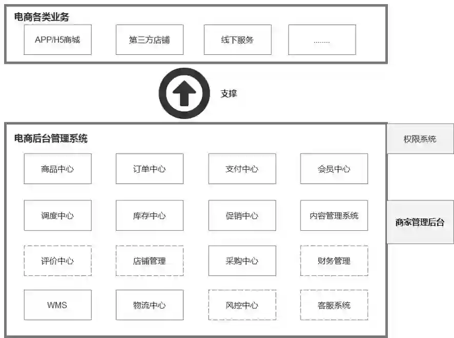 支撑电商的关键系统,往往在于后台系统。很多公司将其拆分为很多子系统,阿里更将其发展成了中台事业群(搜索事业部、共享业务平台、数据技术)。