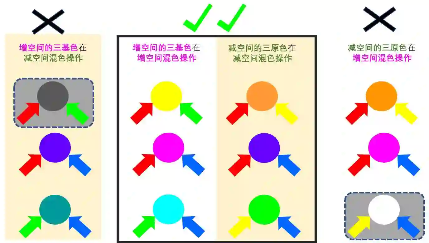 记得20多年前刚上初中时,物理课本上讲颜色就提到三原色与三基色,已经记不清老师怎么介绍三原色与三基色及其联系与对比的细节了,只是死记硬背三基色红绿蓝,三原色红黄蓝。这里有几个基本的问题,一是二维色调空间中(先不考虑亮度自由度)坐标值只有两个,而基的数目却为什么需要3个而不是两个?这个问题比较简单,因为与通常平面坐标系不一样,颜色混合操作没有负向或相反方向操作,如果两个基最多智能覆盖两个象限,要覆盖四象限,只能再增加一个基。第二个问题,两种颜色系统差异是什么,也是比较清楚的已有知识,如图4所示,三基色与三原色分别属于颜色相加与相减空间操作,通俗的说,三基色增空间混色操作比如显示单元或探测单元中多基色光混叠,那么混合种类越杂越接近于白色,而减空间中混色操作比如多种颜料混合,混合种类越多,颜料吸收的波段越宽,反射或透射的就越窄,则混合种类越杂越接近黑色,因而将增空间的三基色用于减空间混色操作,或者减空间中的三原色用于增空间混色操作都达不到覆盖整个颜色空间的效果。最后一个问题,三原色与三基色之间的内在物理联系是什么?在人类已有的知识库中检索未见答案的情况下,作者经过几天的思考和总结获得一个备选答案如下: