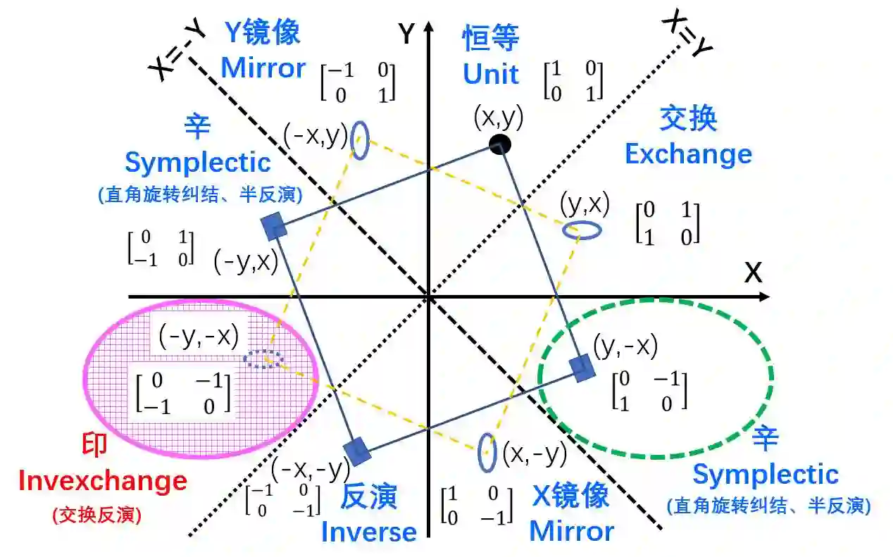 在平直或极坐标颜色空间的色轮中将三原色与三基色分别标记出来,如图5所示,可以看到三原色与三基色分别占据一个半轮,两个半轮之间共享红绿线,主观上对应颜色能量的盈亏或四季中的秋春两季,而第三个颜色分别是黄色与蓝色,分别对应主观上的暖色与冷色或四季中的夏冬两季,很好理解增空间中的颜色操作需要冷色调作为基,减空间中需要暖色调作为基,否则操作结果就不是覆盖整个色轮,而是分别走向白与黑的极端。那么这两个半轮之间的关系怎样?根据简单的对称性介绍[6],两个半轮貌似辛对称symplectic symmetry,它是数学物理学家外尔Weyl构造的词[7],具体说明参见本文第五节名词索引,它通过旋转90度操作让其中一个基反向并与另一个基交换,但从图5中不难看出辛对称并不能很好的用来刻画三原色与三基色两个半轮的关系,关键在于上一节提到的色轮在红色与紫色之间存在对称缺口,尽管被人类视觉系统掩盖,但客观存在,该缺口的存在不允许两个半色环之间进行简单的旋转对称操作,那应该是什么呢?根据研究基本的代数群的几何表示[8],尤其是二维色调系统中可能用到的所有的对称操作,用坐标、矩阵、对称线等汇总表示如图6所示,这时不难发现可以满足冷暖色调进行正负对调的对称性除了辛是一个可能外,还有一个非常重要但在数学物理研究中很少被提及的一个对称,如图中用红网圈出的交换反演对称,文献中找不到一个可拿来称呼的名称,作者这里不妨模仿外尔制造symplectic(“对称”与“复”词根组合)和华罗庚先生翻译成“辛”,构造交换反演对称操作的英文名称invexchange,中文“印”,用来描述颜色增空间与颜色减空间之间,满足色轮上红-紫颜色存在内在破缺带来的新的对称变换同时保持不变的内在联系。更普遍的应用可推广到圆环对称性因为存在内部裂缝而破缺的条件下的保持增减互补对称不变的情形。有人认为颜色基的选择可以任意选择,比如图4中在增空间中做增操作形成的浅蓝-洋红-黄CMY三色可以作为减空间中的红黄蓝的替代,实际上打印机颜料中也在使用这样的混合,与黑色blacK一起构成的CMYK色系是最经济的一种配色方案,但作者认为在数学物理角度看,CMY不能替代甚至撼动红黄蓝的三原色地位,仍然参考图5所示的内在破缺位置,不难看出M与CY不大一样,是人类假想的颜色没有单一波长光与之对应,因而说三原色与三基色是天然选择了红黄蓝与红绿蓝,这一对互为印对称的颜色基,无法被其他组合取代。
