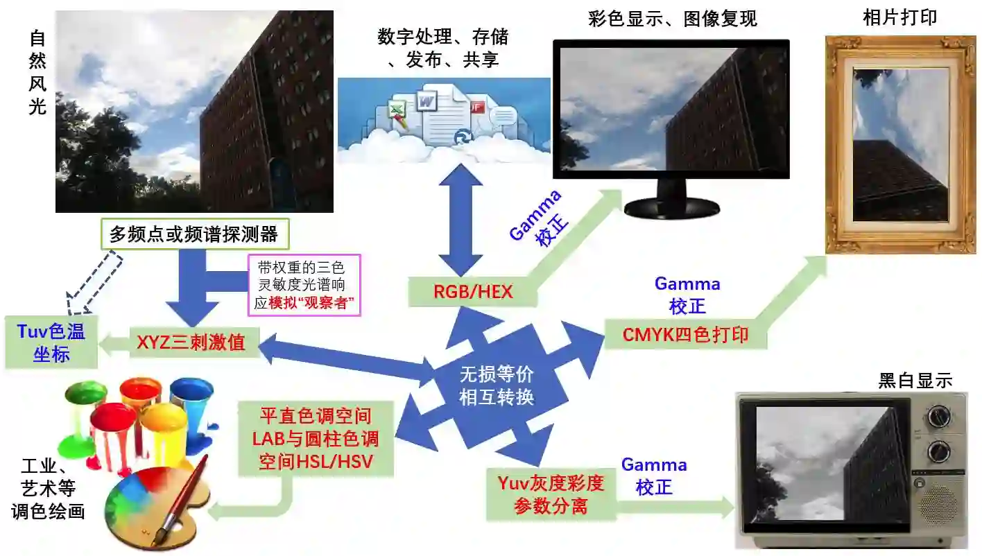一个是为什么会有那么多不同的颜色表示系统?答案很简单,因为颜色的应用场景很多,且多个场景的表示和应用不明显共享参变量。如今数码时代3岁婴儿都会拍照,殊不知不到1秒的拍照过程涉及到隐藏的颜色相关过程其实相当复杂,参考作者汇总结果如图7所示,拿一幅作者所在办公大楼在蓝天下一角的照片举例,该数码照片的拍摄过程是一个颜色获取、记录、处理、显示过程,在传感器对自然风景成像,第一步是模拟观察者将原始多频点探测器响应信号转换成XYZ三刺激值(此时可以顺便获得色温信息,避免后期转换会碰到同温异色更异谱的麻烦),XYZ可以通过无损的线性矩阵变换获得红绿蓝RGB值或一个六位十六进制数表示的颜色,用于存储、发布或云共享;此时如果要在屏幕显示,还涉及到gamma伽马校正,否则会因为线性RGB色度空间与人眼感知的非线性不匹配带来颜色失真的问题(属于网上搜索结果一堆的已有知识,不多讲);随后,如果要将风景打印或数码冲印出来,需要将RGB转换成到前面提及的经济的CMYK油墨配色坐标体系;还有一种现在可能不太常用的情形是将数码照片黑白显示,这时需要使用灰度彩度参数分离的亮度色差Yuv系统;最后值得一提的是工业、艺术等调色绘画的应用场景中平直色调空间亮度色调实部虚部LAB或圆柱色调空间色调饱和亮度/色调饱和色纯HSL/HSV系统则会经常被用到。