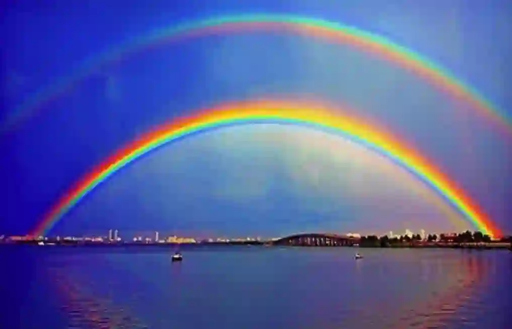 图1 水上蓝天白云虹霓显示大自然的颜色之美(图片源自https://physics.stackexchange.com)