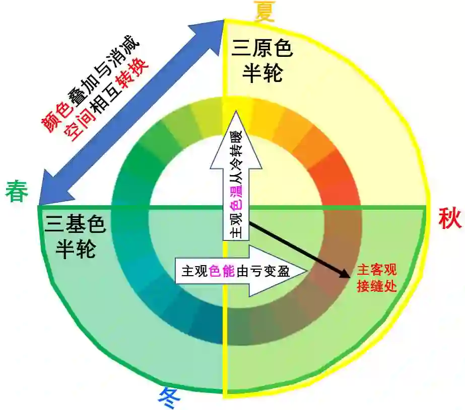 主观色温/黄蓝度/复数色调虚部(subjective color temperature, imaginary part of complex color number):主观上区分颜色的温度贵贱,蓝色表示色调温度偏冷,但潜力大,而黄色表示色调温度偏暖,类似季节中的冬、夏两季,而类似春、秋的纯绿或纯红的主观温度则不冷不暖(此时虚部为零)。注意这里色温的概念,仅仅是主观定性表达,与物理与工程中的温度之间无定量的结构或性质关联。