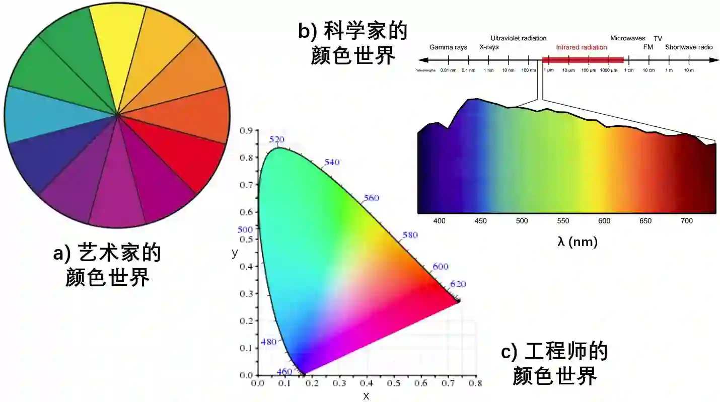 颜色的学问散落在人类认知的方方面面,从宗教的黑白无常、色即是空到艺术的音色画色调谐,从颜色心理学到定量色度色谱科学,从基本粒子夸克之间强相互作用量子色动力学到用星光发射光谱和红移研究的宇宙学,从真实自然的五彩到计算机虚拟世界的斑斓,一定有永远也说不完的话题,写几十本书都不过分。即便作为仪器工程师,作者如就颜色测量这一小点具体讨论开也包括光谱仪、色谱仪、光度计、色度计、照度计等仪器设备,也够开好几门课[4]。但这些都不是本文写作的动机,因为如果仅仅将已有知识颠来倒去的翻腾,难以刷新自己或读者的认知,浪费自己精力不说,还白白耽误读者宝贵的阅读时间,很不值得,因而并非作者乐意而为之事。相反,如果文章让不同认知程度的读者在三、五分钟的阅读时间里都能或多或少的发生一点对极其基本概念认知上的刷新,哪怕作者投入更大的精力让文章图文更加精炼好懂,总体而言值得去做。因而本文只聚焦在作者思索多年且未曾通过已有的知识渠道获得圆满答案的三个问题点: