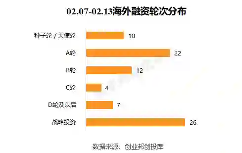 本周海外融资事件的融资轮次主要集中在前期(种子轮、天使轮、A轮),共32起;中后期(B轮、C轮、D轮及以后)有23起;战略投资有26起。