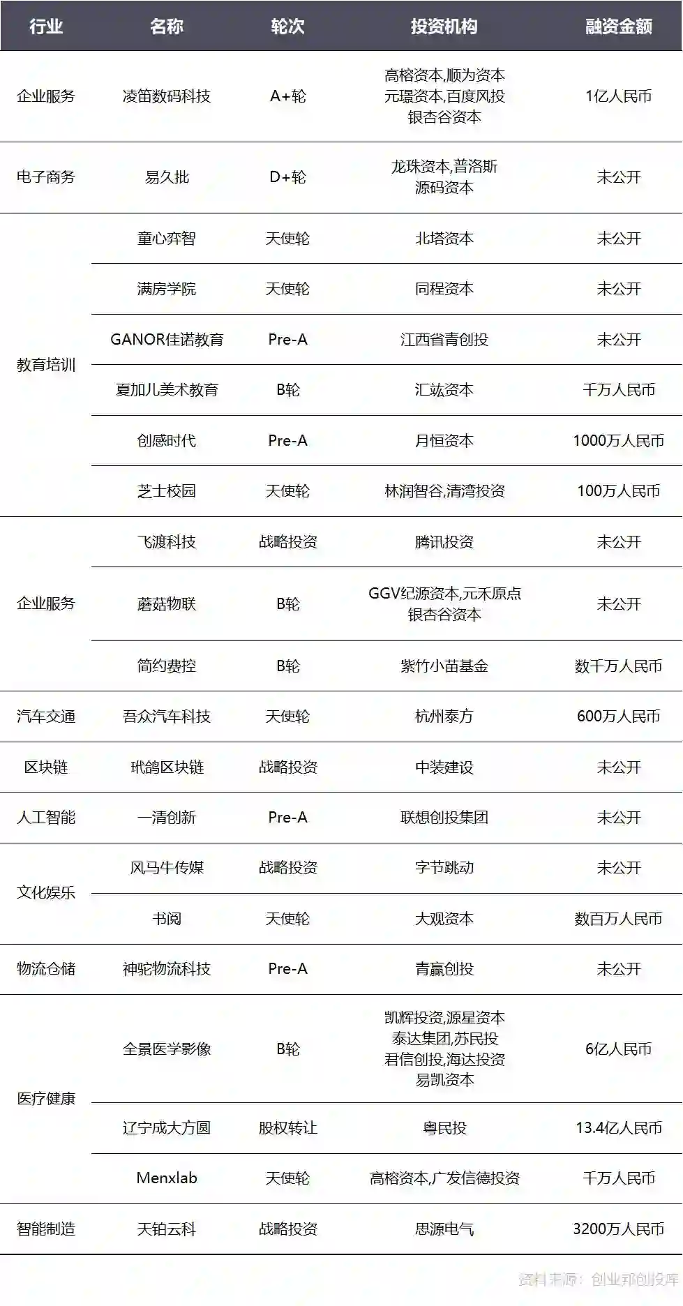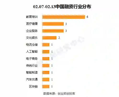 本周披露融资事件涉及11个行业领域,其中教育培训6起,医疗健康、企业服务并列3起,文化娱乐2起,物流仓储、人工智能、电子商务、传统行业、智能制造、汽车交通、区块链各1起。