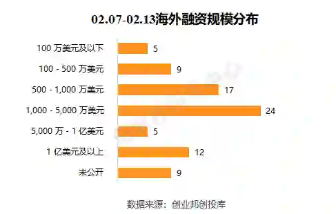 本周海外融资事件的融资规模主要集中在1,000-5,000万美元,共24起。