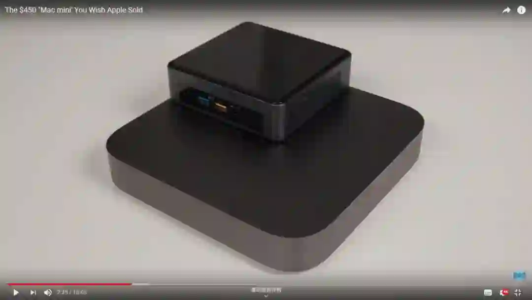 NUC 整体非常简洁,正方形的机身、通体黑色的外观让 NUC 即使摆在桌子上也非常优雅,更不要提仅仅 10cm 长宽(117mm * 112 mm * 36mm)的外形。在 Snazzy Labs 的 YouTube 视频 The $450 "Mac mini' You Wish Apple Sold 里面有这样的一个对比: