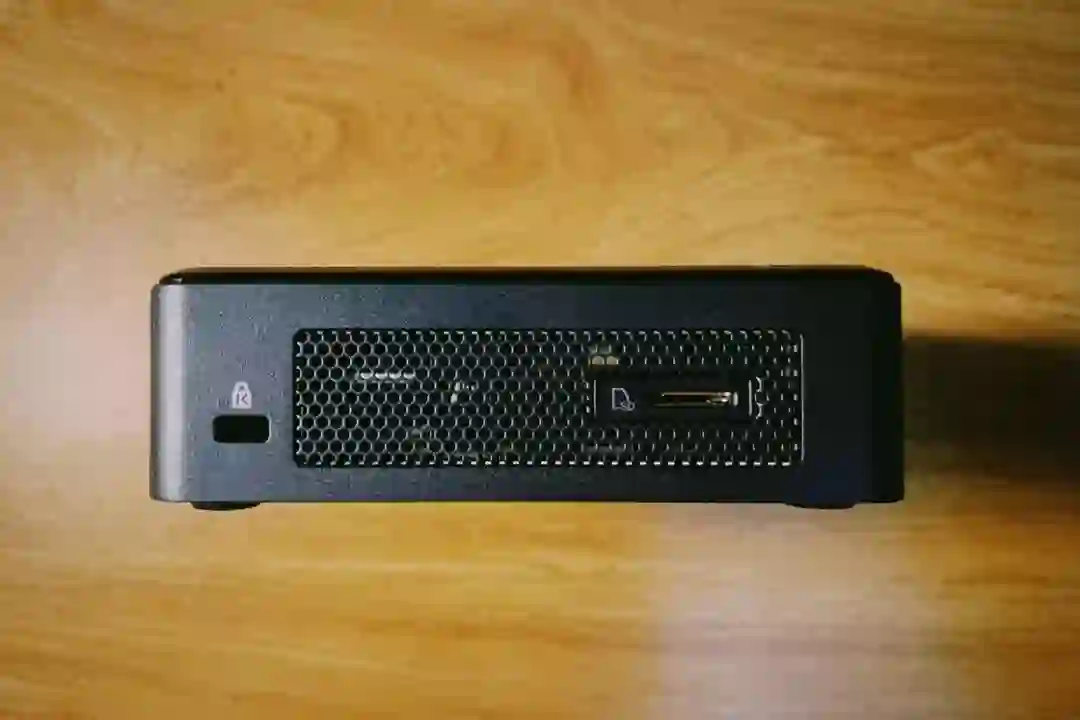 我们从前面板开始,小巧的 NUC 机箱前面板有: