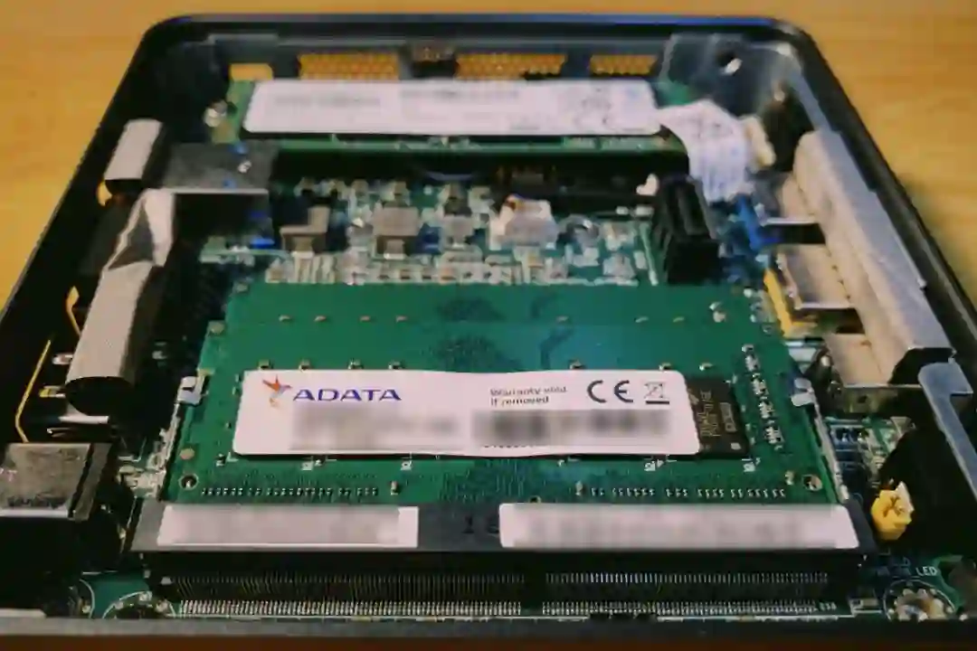 NUC 里面有两个内存条卡槽,支持最高 2 × 16GB 共 32GB 的双通道内存。我购买了 ADATA 的两条 8G 笔记本内存条,组成了 16GB 的双通道内存。需要注意的是,NUC 所使用的并不是全尺寸台式机内存条,而是笔记本内存条。所以最初我购买了两条全尺寸台式机内存回来,正兴高采烈的准备进行组装,结果发现内存条本身比我 NUC 机箱还要大的时候,内心是多么崩溃。