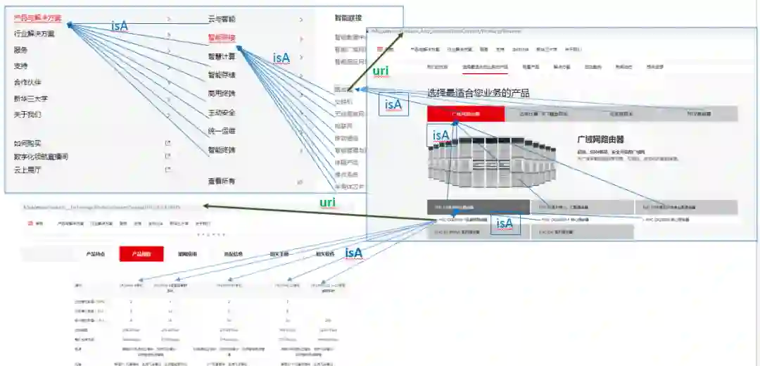 知识处理一定是一个从易到难,从粗到细、从人工到自动的过程。首先,为了构建一个初始的知识库,首要的目标是数据结构化。资料管理通常是树形结构,如新华三官网,以树状结构梳理了产品类型-产品系列-规格型号的关系,在产品规格型号一页,又以表格记录了产品的各种软硬件规格描述。所以,可以使用爬虫系统收集和解析产品之间“isA”和“sameAs”的关系,以无监督+词向量的方式对齐了产品规格特性,最终以模板映射到图上三元组关系。