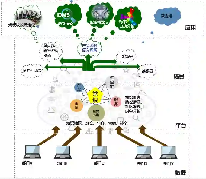 以新华三集团为例,这种面向全产业链多发展的企业,若拥有一个知识大脑,可以做到从市场到解决方案到研发到供应链,从芯片到云到网、边、端的知识全面拉通。而构建数字大脑的基础,首先需要行业常识库(http://openkg.cn/dataset/network-communication),这个常识库可以从词汇及理解每一个环境的行业要素。相当于以常识库为纽带,全面支撑起“物-料-人-法-环”的各类关系。当各环节部门众包自己的数据,数据经过与核心常识库的实体、本体进行融合、对齐、消歧,知识大脑认知能力逐渐提升,最终形成的知识网络将时数据能量将务必巨大。