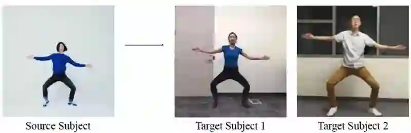 应用全局姿势标准化来解释框架内的体形和位置中的源和目标主体之间的差异;