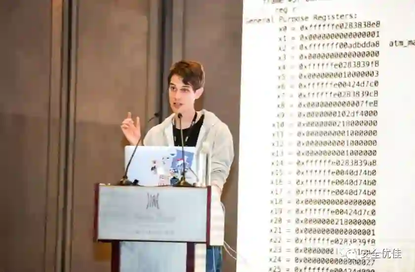 来自Google Project Zero团队的Ian Beer分享了议题《构造你自己的iOS内核调试器》 。lldb调ios内核应该是每个研究人员的梦想了,Ian beer通过一个内核任意读写漏洞,开启了本来深藏于内核中的硬件断点,每个syscall进入前会陷入他的代码,修改系统寄存器,开启调试。他现场展示了iPhone 6s的调试,从arm手册的异常寄存器讲起,还对比大家熟知的x86架构,深入每个细节,一秒都不能错过。