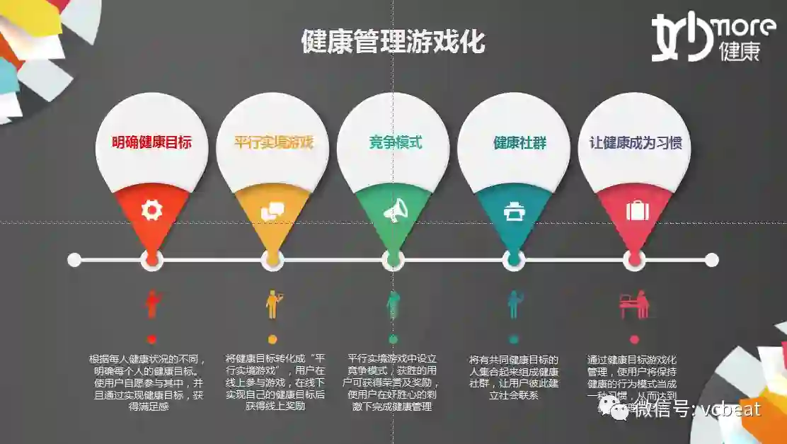 通过明确健康目标-平行实境游戏-设置竞争模式-组建健康社群的模式,最终达到让健康成为习惯。