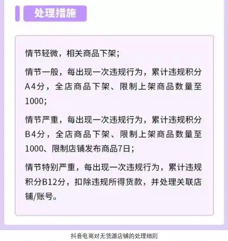 还有前面提到的抖音屏蔽#无货源 话题标签,与之对应,几个月前抖音专门针对无货源小店发布新规:当识别到商家店铺涉嫌无货源经营时,抖音有权利对商品或店铺进行限制,并根据违规程度对商家进行分级处理。