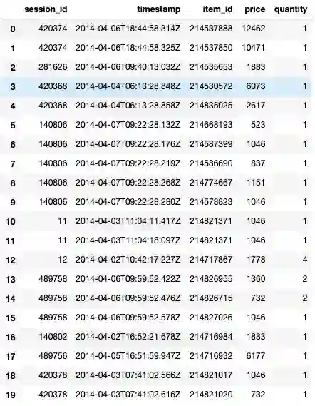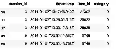 挑战提供了两组主要数据,yoochoose-clicks.dat和yoochoose-buys.dat,分别包含点击事件和购买事件。 让我们快速浏览一下数据: