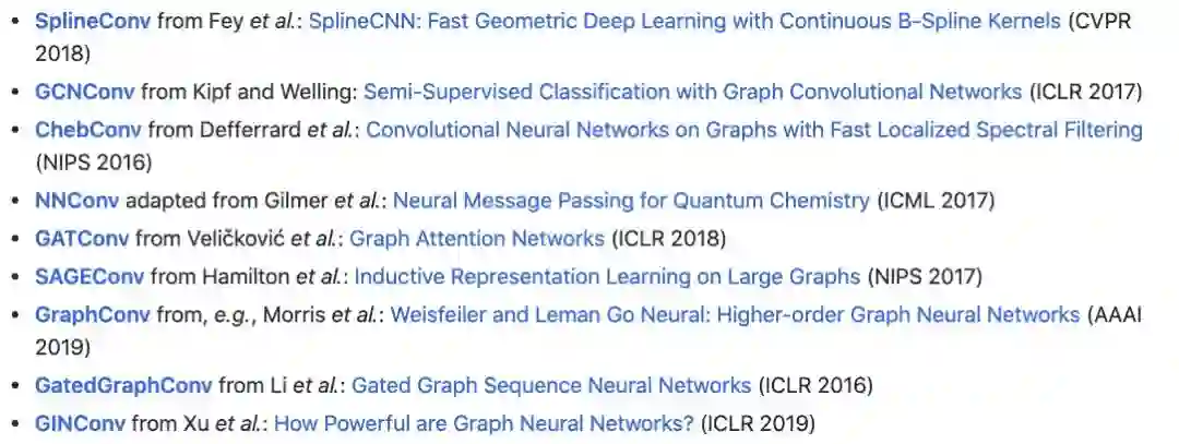 除了惊人的速度之外,PyG还提供了一系列精心实现的GNN模型,并在各种论文中进行了说明。 因此,用PyG重现实验将非常方便。
