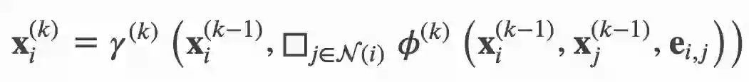 x表示节点嵌入,e表示边缘特征,φ表示消息函数,□表示聚合函数,γ表示更新函数。如果图中的边没有连通性以外的特征,则e基本上是图的边缘索引。上标表示图层的索引。当k = 1时,x表示每个节点的输入特征。下面我将说明每个函数的工作原理: