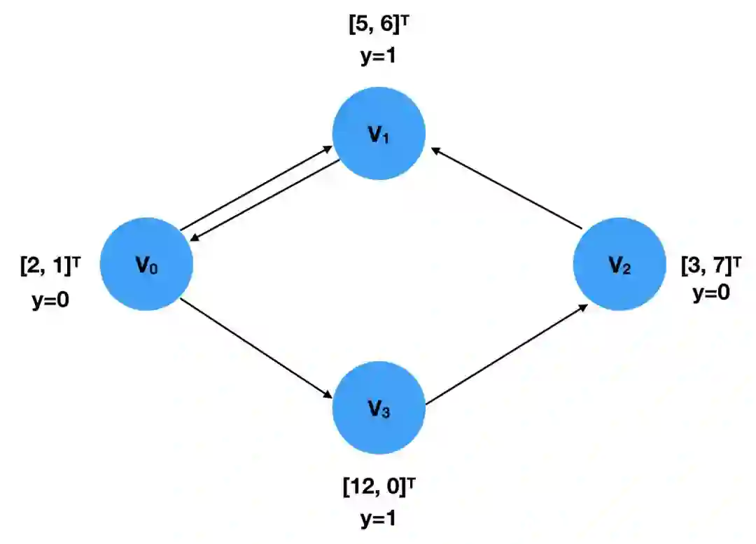 图中有4个节点,v1 ... v4,每个节点与2维特征向量相关联,标签y表示其类。 这两个可以表示为FloatTensors: