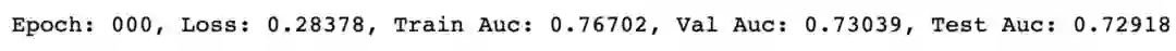 for epoch in range(1):loss = train()train_acc = evaluate(train_loader)val_acc = evaluate(val_loader)test_acc = evaluate(test_loader)print('Epoch: {:03d}, Loss: {:.5f}, Train Auc: {:.5f}, Val Auc: {:.5f}, Test Auc: {:.5f}'.format(epoch, loss, train_acc, val_acc, test_acc))