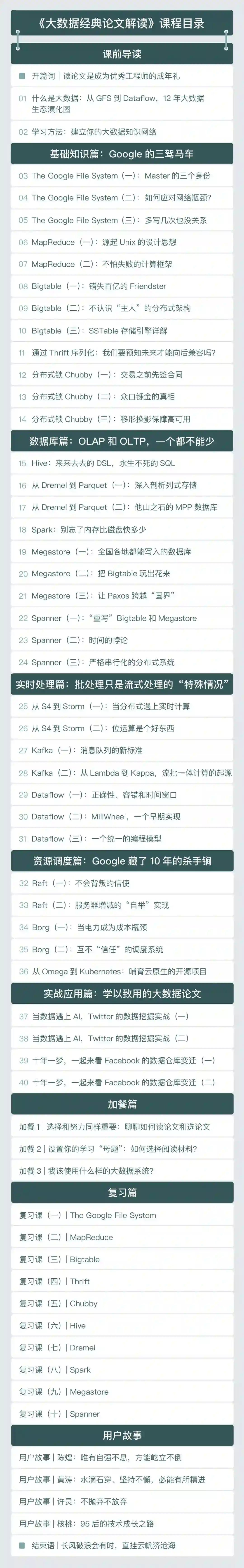 网上这类的资料其实并不多,最近看到极客时间专门做了个专栏《大数据经典论文解读》,我第一时间买来看了看,看目录发现内容太全了,基本覆盖了读论文的痛点问题。
