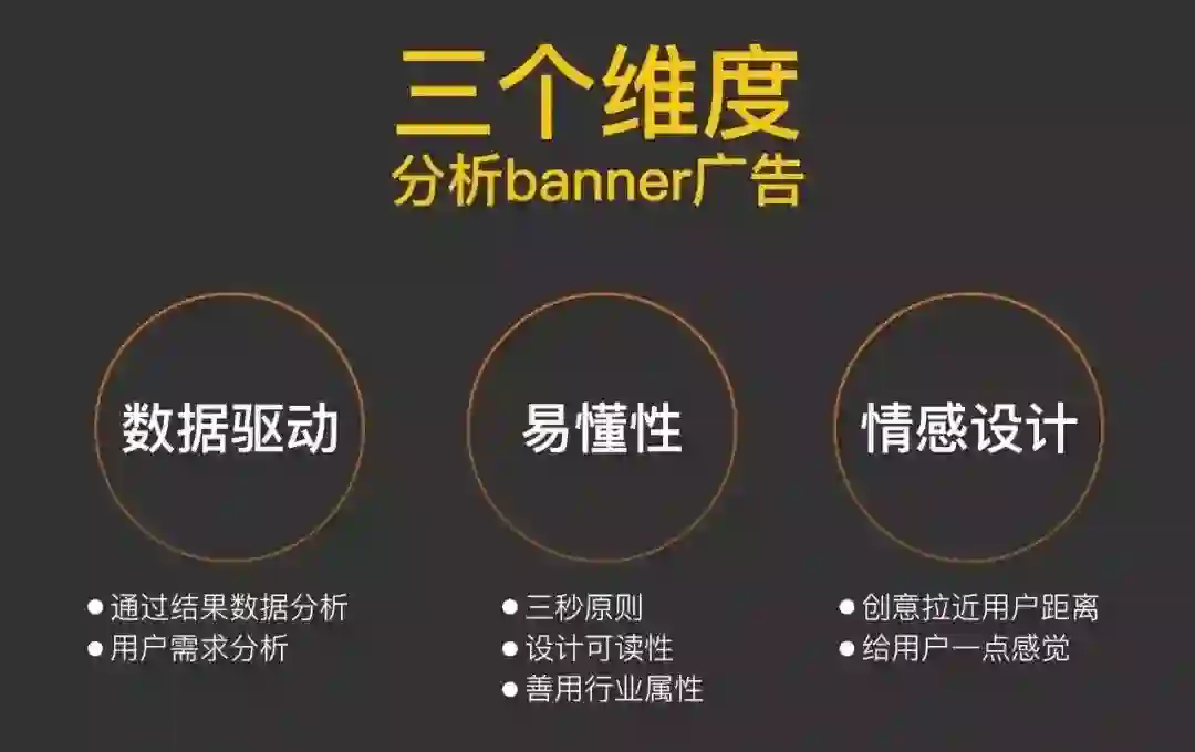 而设计师在设计banner广告图之前,一般会参考之前投放的结果数据,例如设计A类的广告投放量、阅读量、点击率等等数据去分析A图的好坏,再通过大量的数据比对来分析出A图中哪个单一框架所产生的作用更大,从而为后面的设计做参考。
