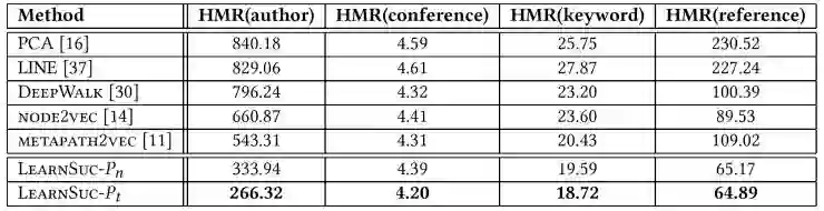 表征学习的方法为我们提供了一些较好的思路:如果我们能够学习到论文以及其包含的上下文项的向量表征的话,我们关心的预测以及推荐问题将会迎刃而解。值得提到的是近两年比较流行网络嵌入学习。这些方法基于保存节点与节点之间邻近度的思路,能够将网中的节点快速地学习成向量表征。当拥有了节点的向量表征之后,我们能够轻易地利用向量內积来运算出节点与节点之间的相似度,从而帮我们完成节点分类与边预测等任务。但网络嵌入学习的方法并不能适用于我们的情况:我们关心的是由一组由多类型上下文项构成的论文是否能够在未来成功发表,而不是该篇论文是否和某一个作者在网中有较高的相似度。