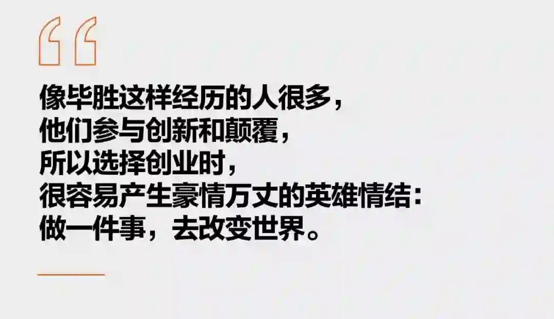 有毕胜这样经历的人很多,他们参与创新和颠覆,所以选择创业时,很容易产生豪情万丈的英雄情结:做一件事,去改变世界。