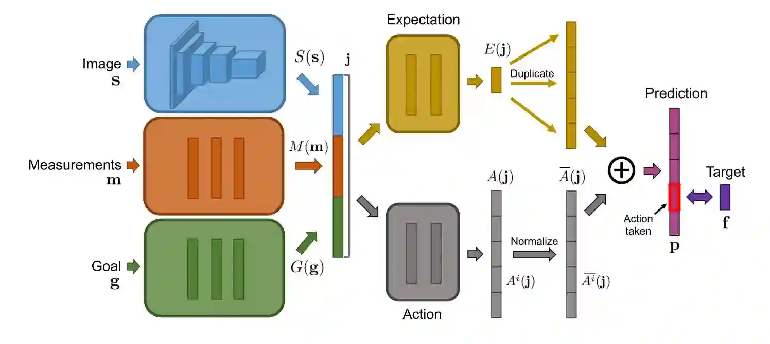 与一般训练agent的过程不同,我们不是去建立状态s和Q值估计值Q(s,a)之间的映射,然后从环境中获得一个奖励r,而是对状态s增加了一系列测量值m和目标g,然后训练网络对每个行动a去预测未来测量值的改变f。