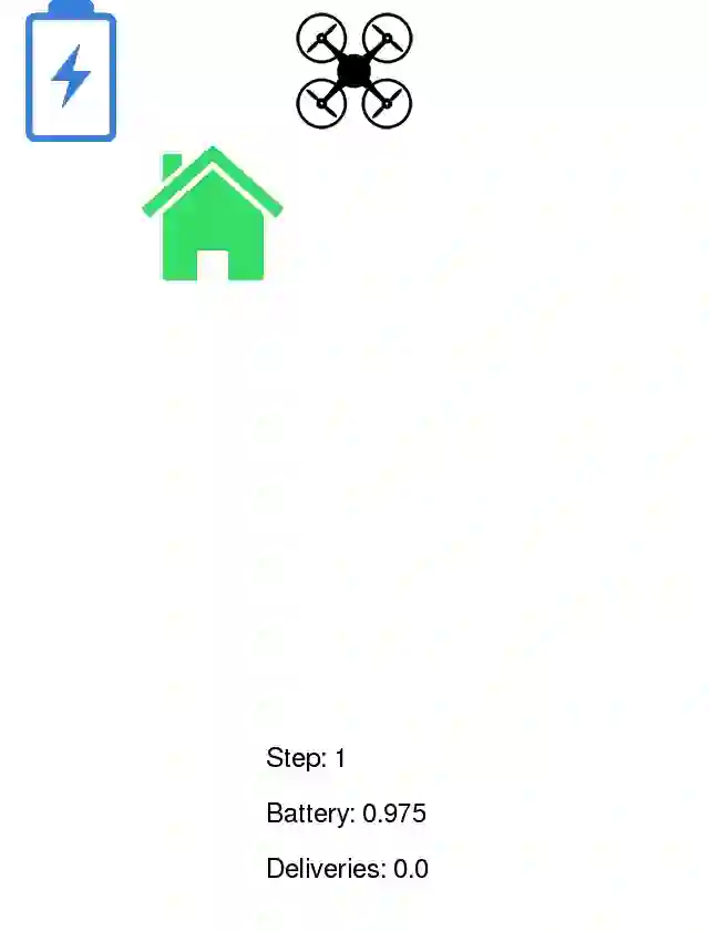 因为电池容量有限、需要经常充电,真实世界中的无人机并不能一直运送包裹。 无人机的每一步行动都会消耗电池中的一部分电量,而一旦电量用完,就意味着无人机将会从空中坠落,无法继续送货,在程序中即象征着没有更多的奖励。