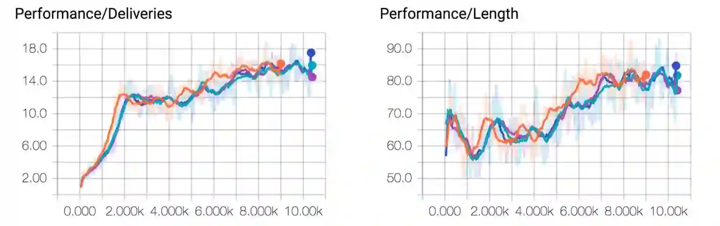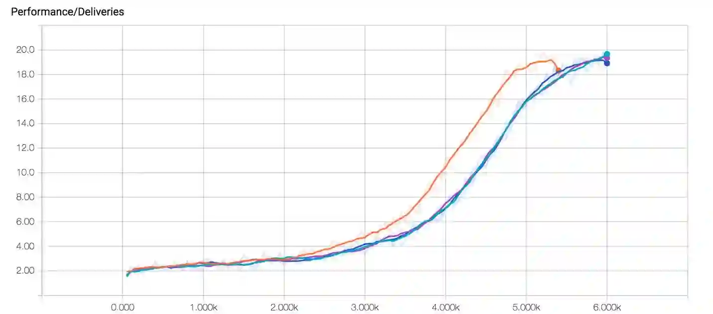 我们可以在环境中增加一个agent可以前往充电的地点。现在所有agent需要做的就是学会在低电量的情况下去充电站充电,在其他情况下正常配送包裹。
