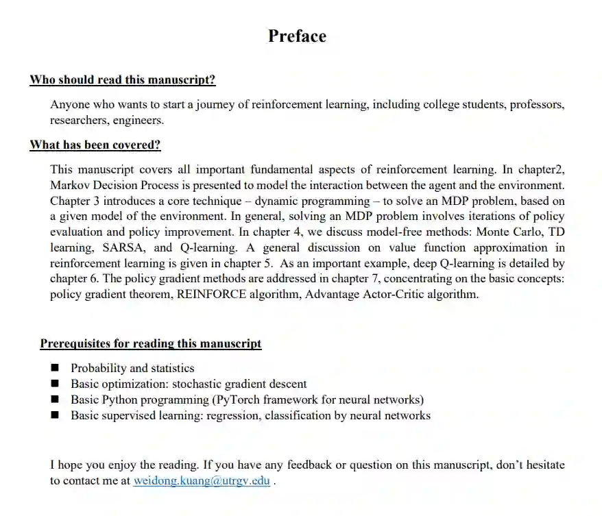 这本手稿涵盖了强化学习的所有重要的基本方面。第二章采用马尔可夫决策过程对主体与环境之间的相互作用进行建模。第三章介绍了基于给定环境模型解决MDP问题的核心技术——动态规划。一般来说,解决MDP问题涉及到政策评估和政策改进的迭代。在第四章中,我们讨论了无模型方法:蒙特卡洛,TD学习,SARSA和q学习。第五章对强化学习中的值函数逼近进行了一般讨论。作为一个重要的例子,深度Q-learning将在第6章中详细介绍。第7章介绍了策略梯度方法,重点介绍了策略梯度定理、REINFORCE算法、Advantage Actor-Critic算法等基本概念。