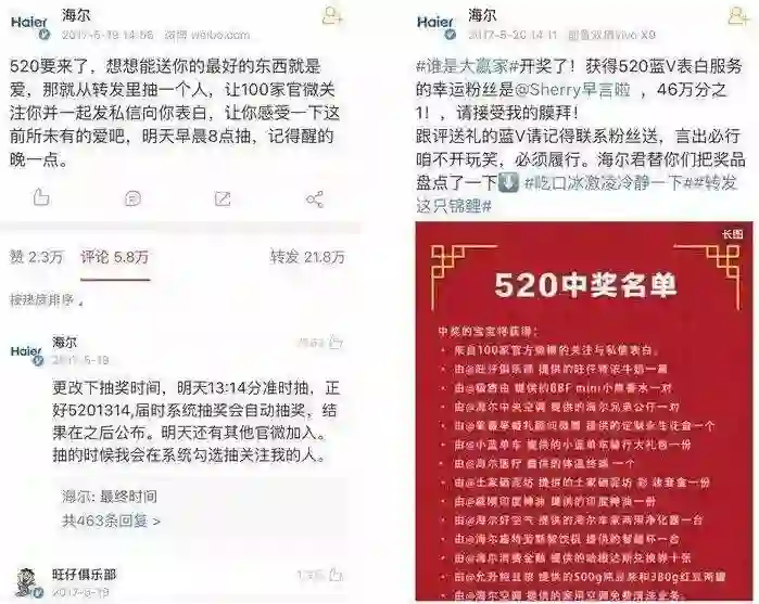 去年5月19日,海尔发布微博,称将从转发微博的用户中抽取一人,获得 100 家官微的关注及私信表白,不送产品送“爱”。