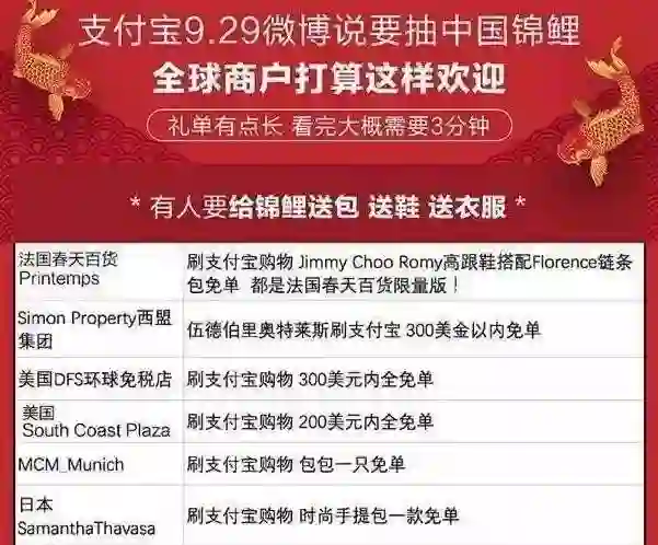 9月29日,支付宝官微发了一条“祝你成为中国锦鲤”的微博,称将在10月7日抽取转发这条微博的一名粉丝为“中国锦鲤”,领取一份超级大礼包。