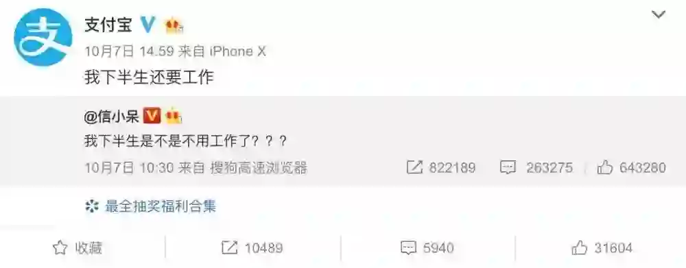 得知中奖后,信小呆“适时”地发布了一条“我下半生是不是不用工作了?”的微博,支付宝则默契回复“我下半生还要工作”。这一来一往加大了网友的热议。而信小呆喜欢的明星李现,则转发了信小呆的微博,并顺势登上了微博热搜榜,支付宝锦鲤活动迎来第二波传播热潮。