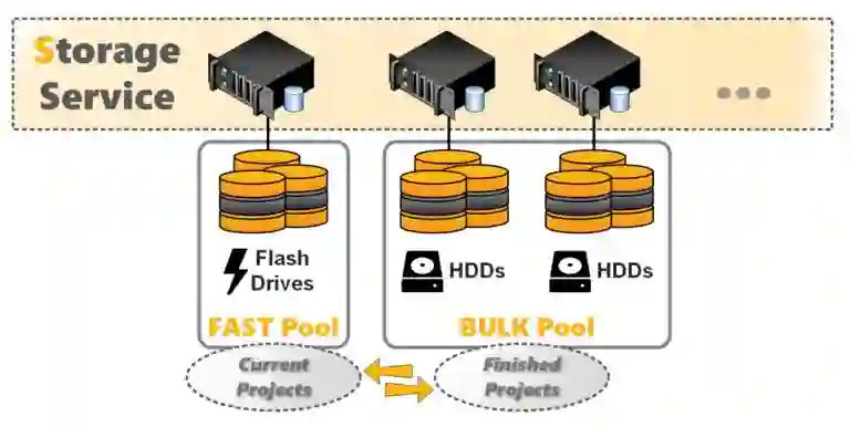 Herold说:“存储池为客户提供了跨命名空间的功能。它们可以分割数据,决定数据是放在底层的高速度还是高密度存储介质上。”存储池让集群管理员可以对存储目标进行分组,并将不同类别的伙伴组(buddy group)镜像到一起。比如说,可能有一个存储池由高速但小容量固态硬盘(SSD)组成,另一个存储池用于批量存储,使用大容量但速度较慢的普通磁盘。存储池可能有描述性名称,因而易于记住要使用哪个存储池,无需查找池中的存储目标。SSD存储池可能命名为“fast”,另一个命名为“bulk”(详见下图)。