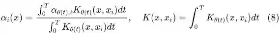 经过一番推导,我们的得到了式(7),它是当学习率趋于 0 的梯度下降的理论解。从推导过程可以看到,这个结果只依赖于梯度下降本身,跟模型具体结构没关系。对于式(7),我们可以从下面的角度理解它。